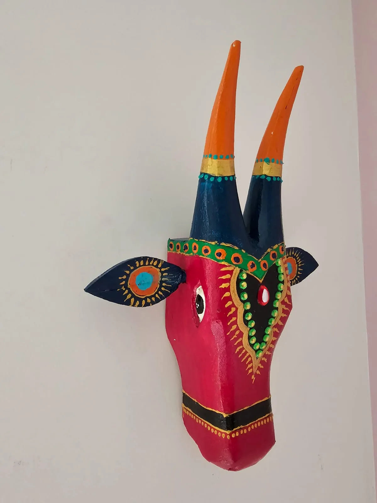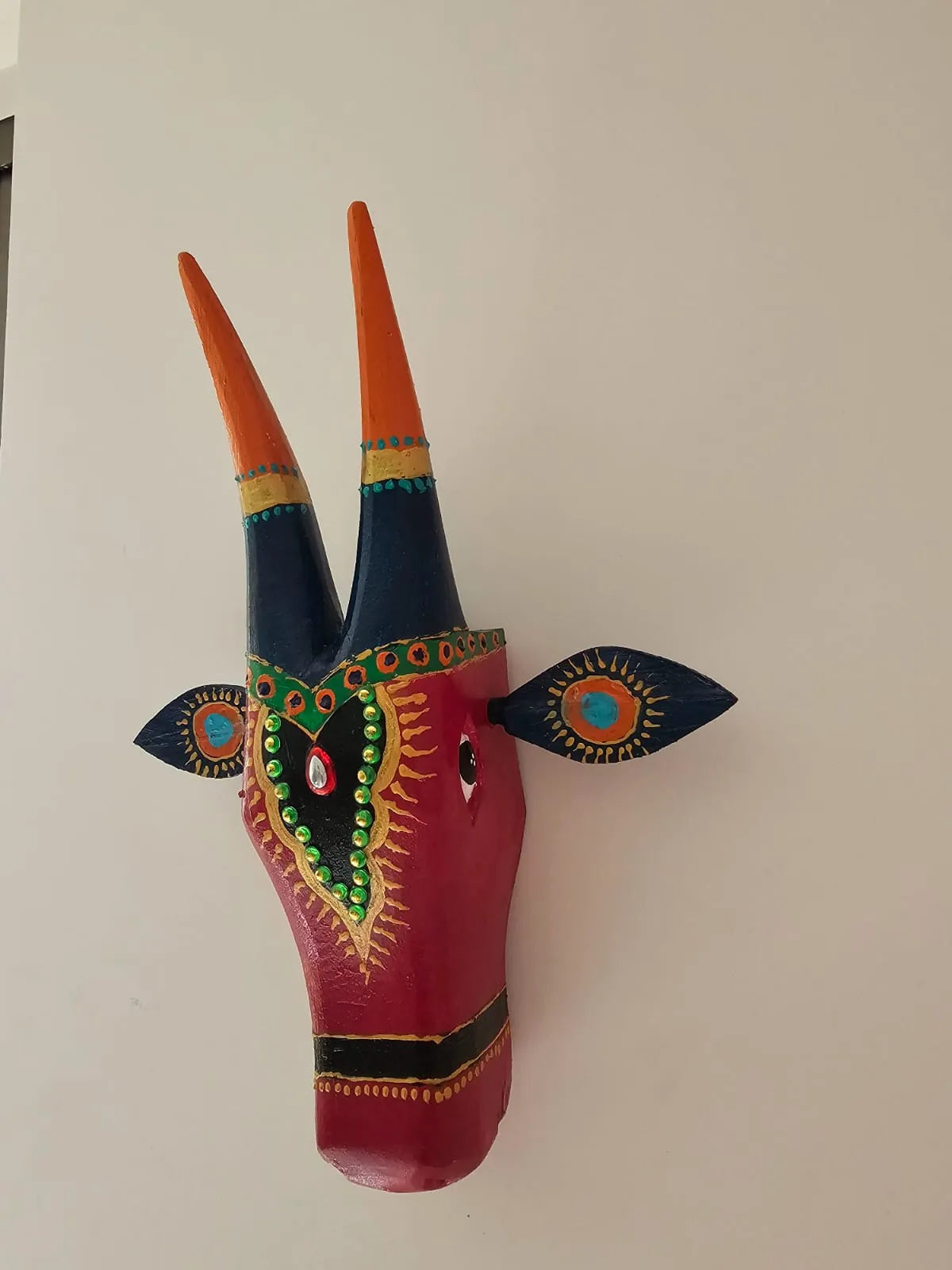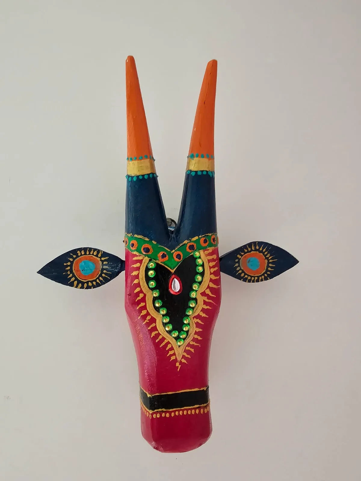 Add a splash of vibrant tradition to your space with this colorful hand-painted wooden cow head, adorned with intricate patterns and mirror work for a charming ethnic touch.ย