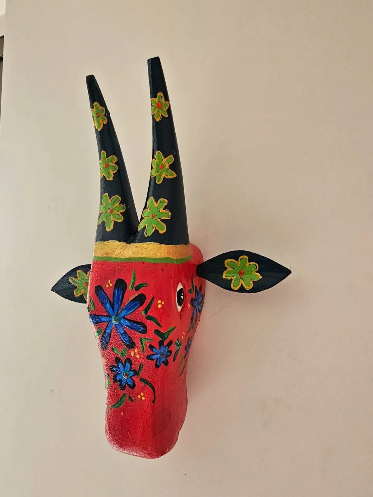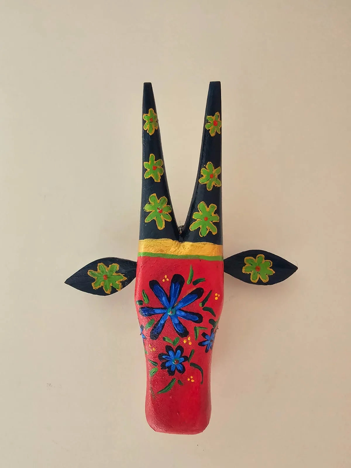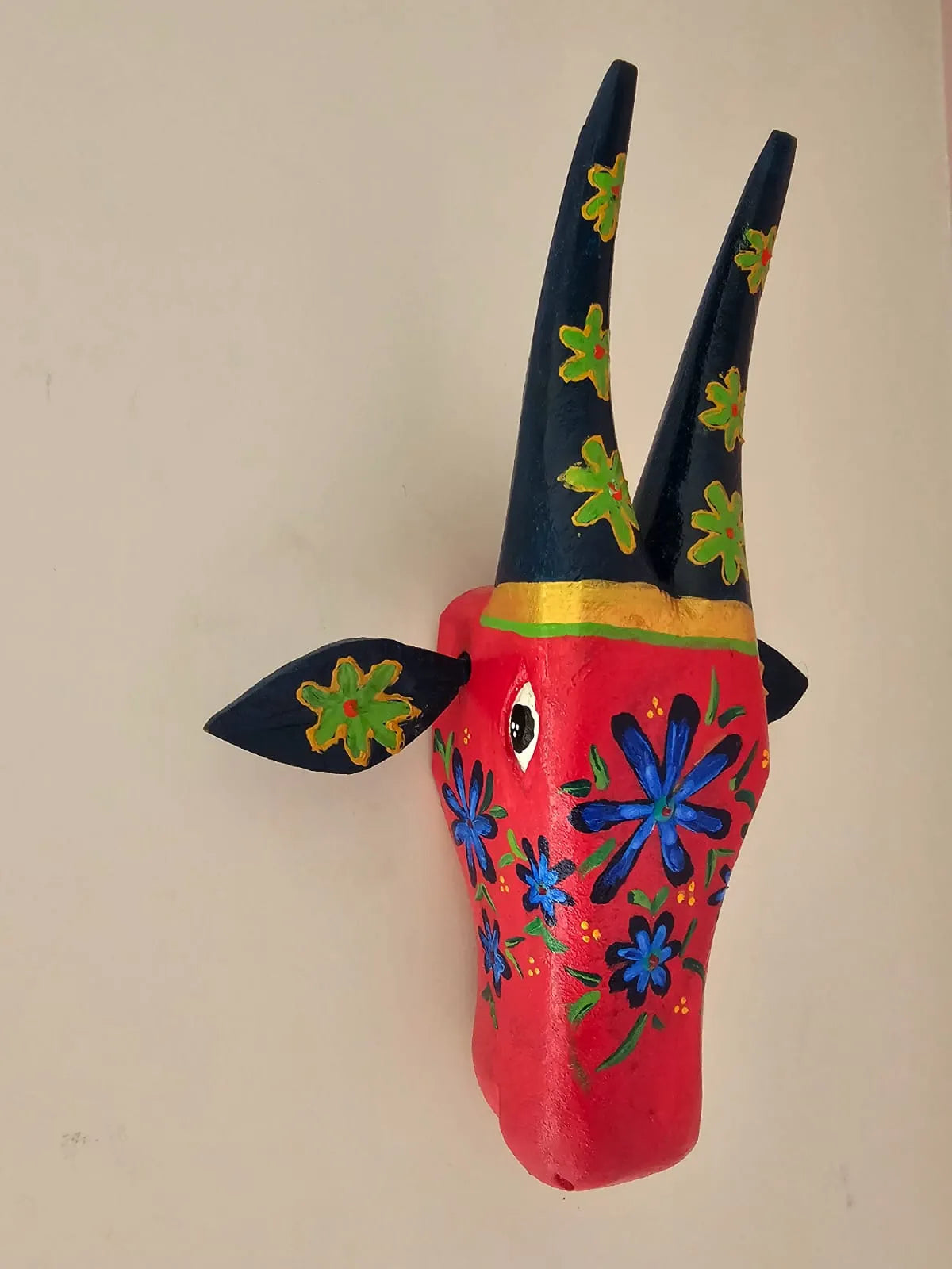 Add a splash of vibrant tradition to your space with this colorful hand-painted wooden cow head, adorned with intricate patterns and mirror work for a charming ethnic touch.ย