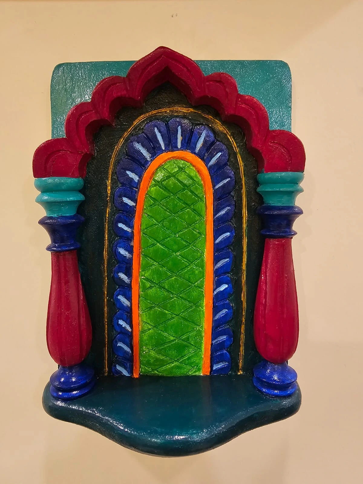 Bring home a touch of royal elegance with this vividly hand-painted wooden jharokha. Its intricate detailing and rich colors make it a perfect statement piece for adding traditional charm to your walls