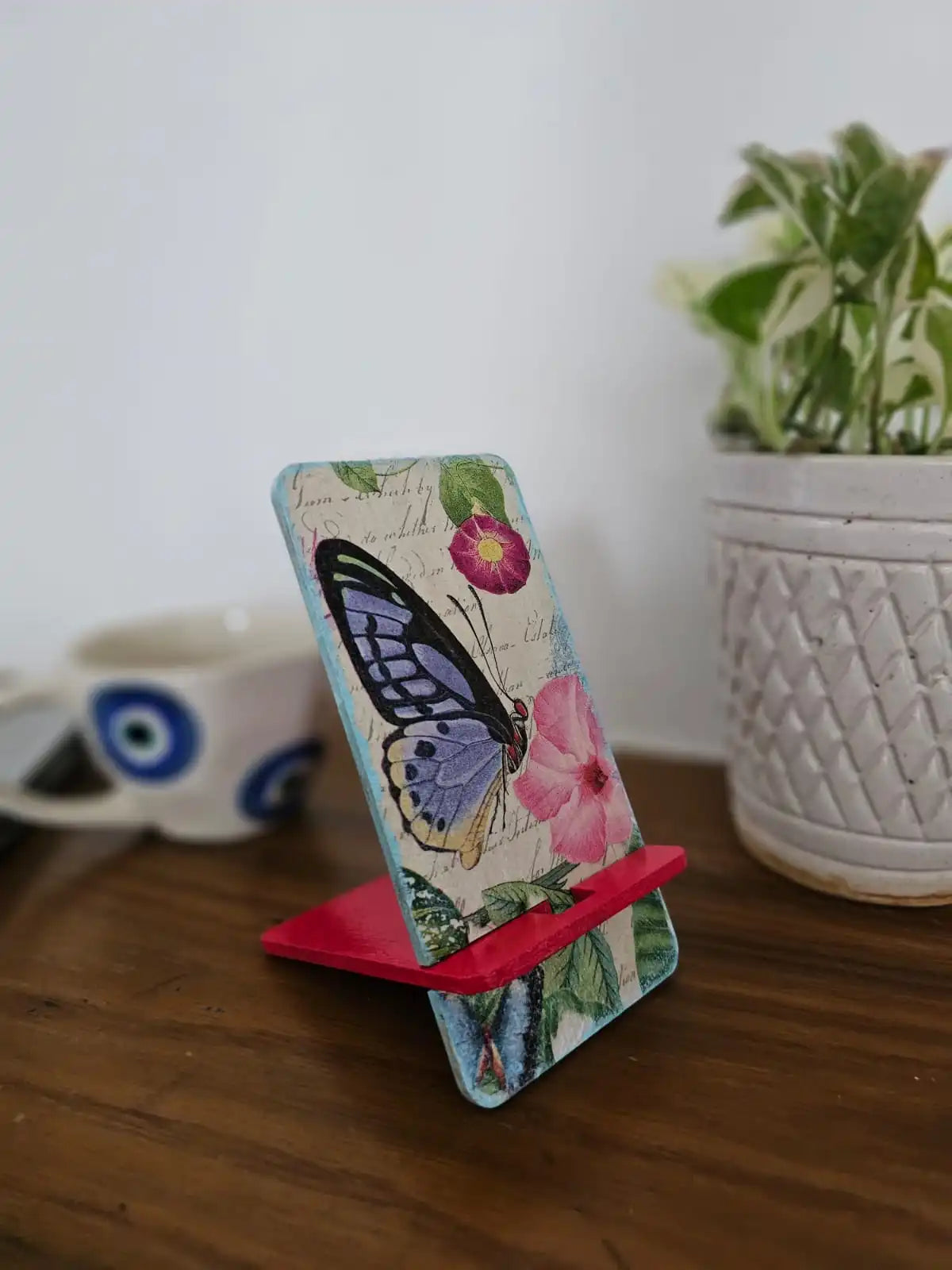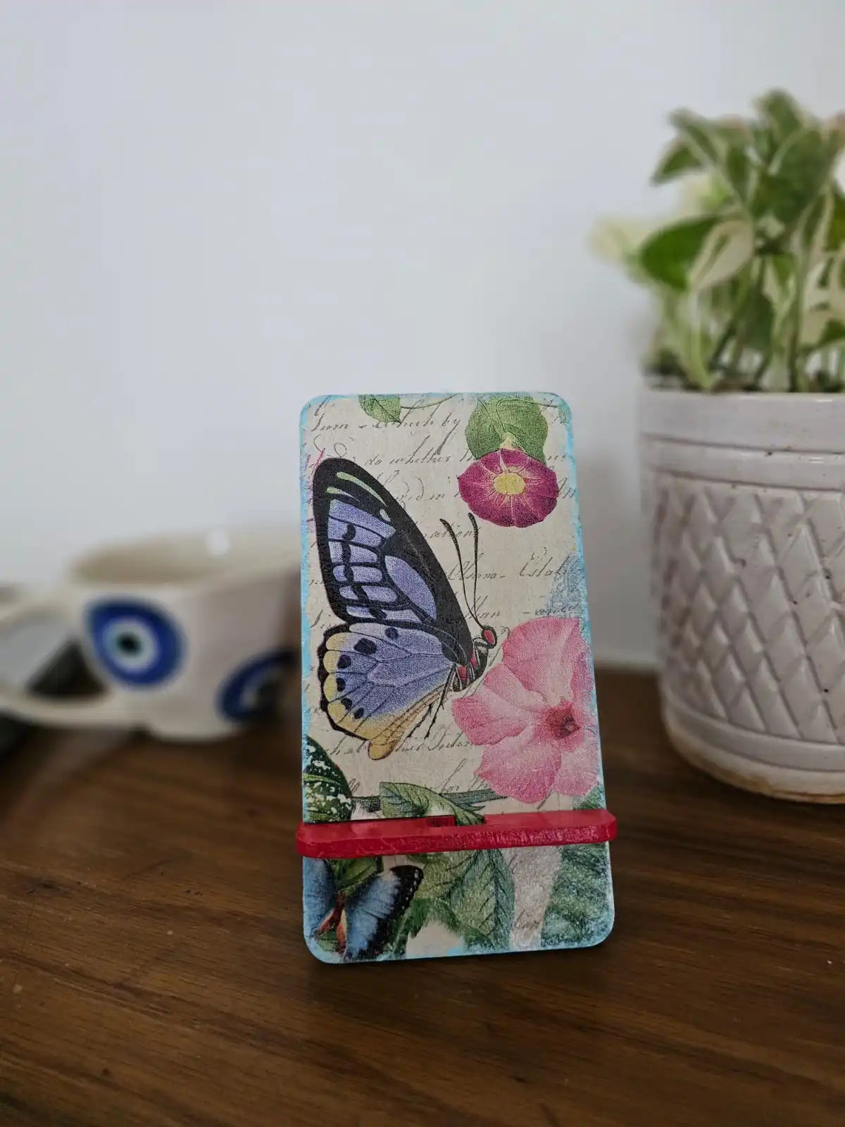 Bring warmth to your workspace with this Adorable decoupaged wooden phone stand. Practical and charming, it keeps your phone upright while adding a touch of comfort to your day.