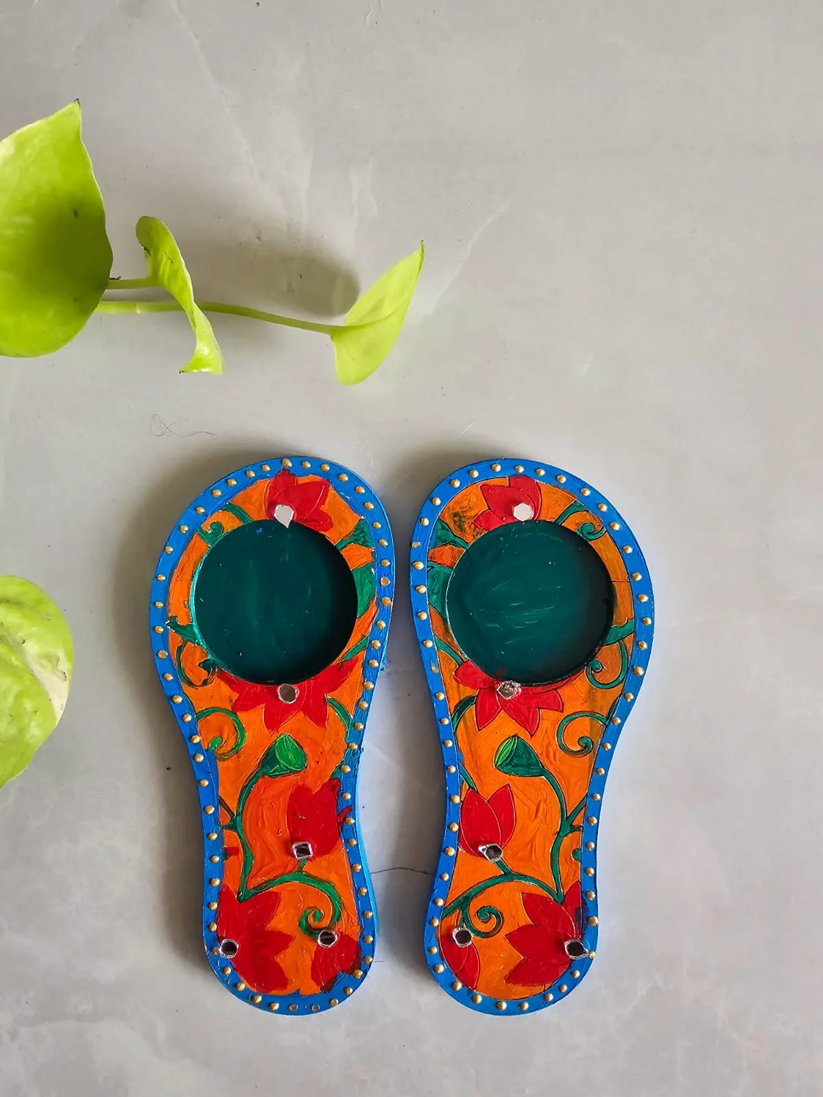 Hand-painted Lakshmi Paduka tealight holders. Shaped like traditional Paduka. each piece is uniquely decorated with vibrant floral patterns and reflective accents. They're perfect for creating a warm, festive, and inviting ambiance for any occasion.