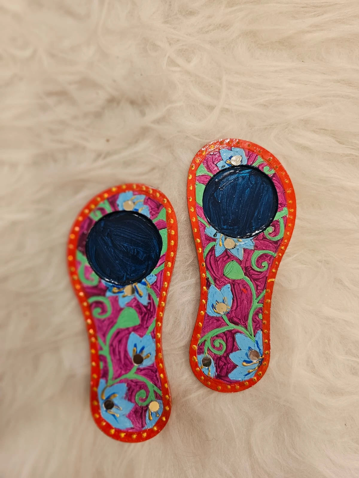 Hand-painted Lakshmi Paduka tealight holders. Shaped like traditional Paduka. each piece is uniquely decorated with vibrant floral patterns and reflective accents. They're perfect for creating a warm, festive, and inviting ambiance for any occasion.