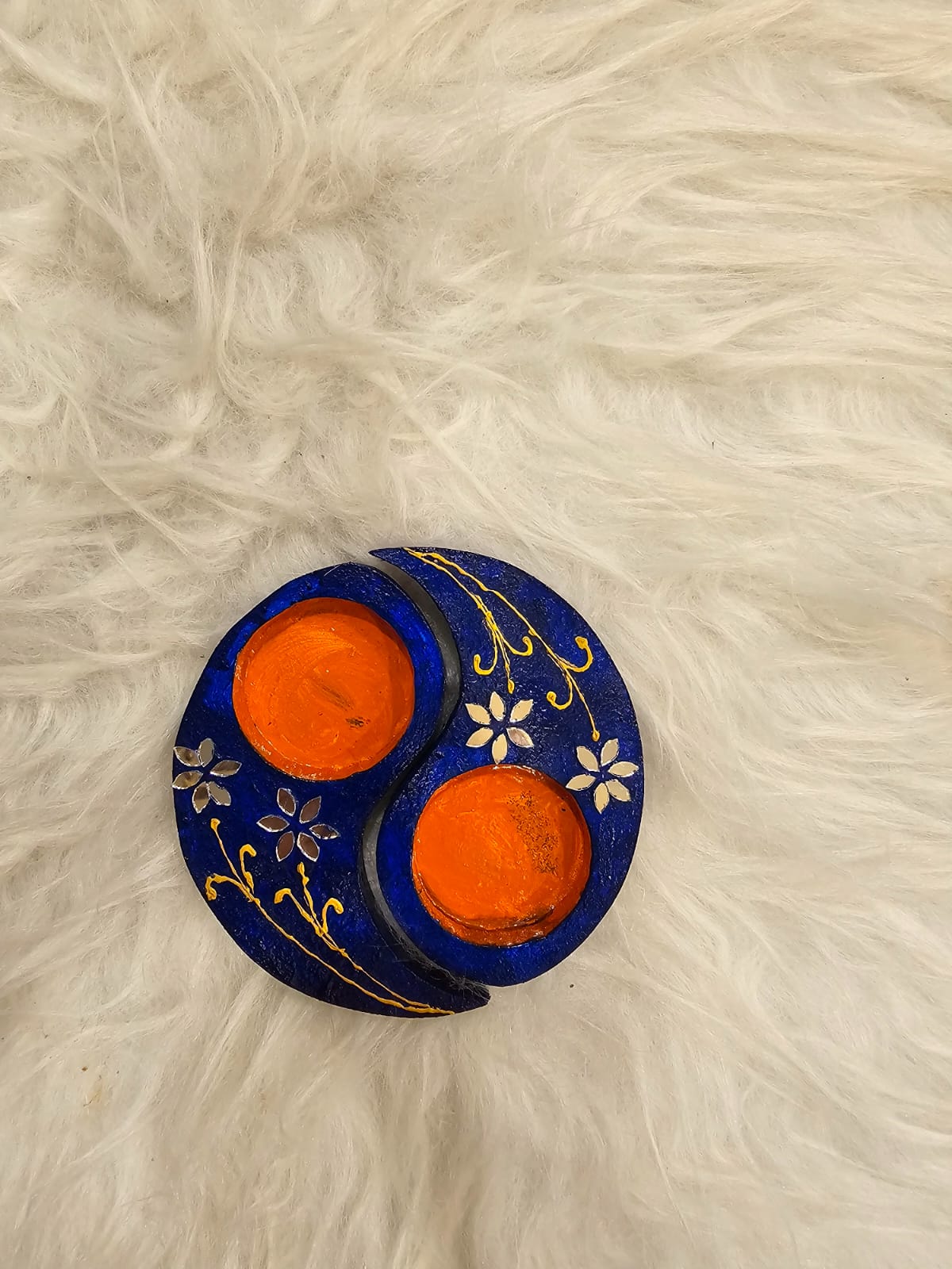 Bring symmetry and serenity to your decor with this unique Yin-Yang inspired tealight holder. Crafted from wood and hand-painted in bold blue and green hues, this piece features delicate golden leaf motifs and embedded mirror accents for a festive sparkle. Ideal for Diwali or as a spiritual home accent, it holds two tealights — representing the balance of energies in any space.