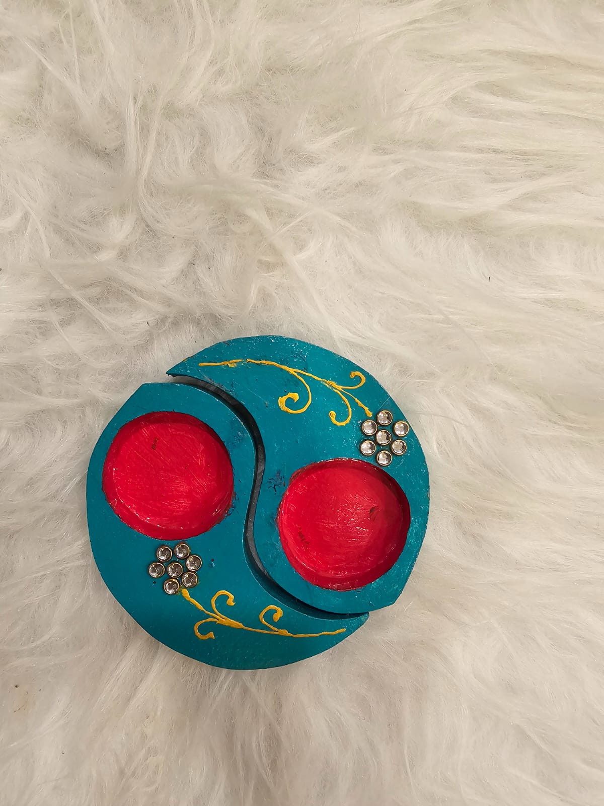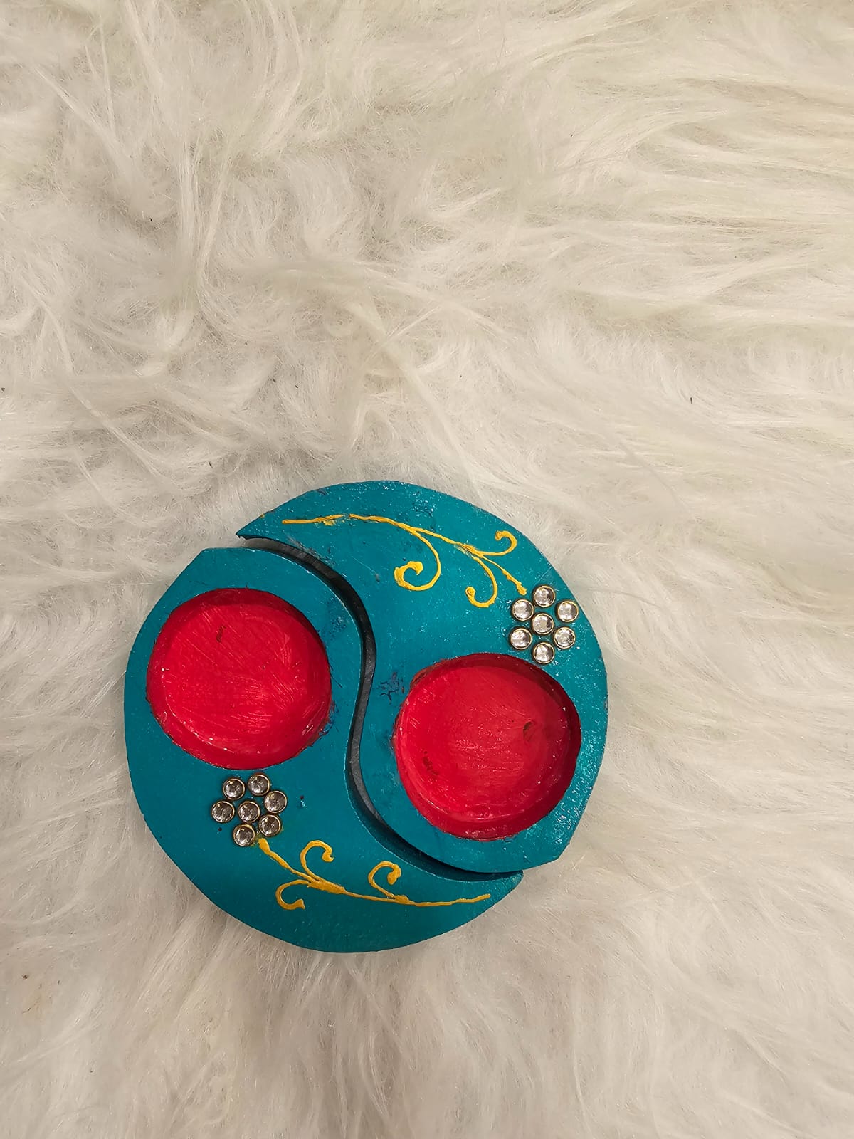 Bring symmetry and serenity to your decor with this unique Yin-Yang inspired tealight holder. Crafted from wood and hand-painted in bold blue and green hues, this piece features delicate golden leaf motifs and embedded mirror accents for a festive sparkle. Ideal for Diwali or as a spiritual home accent, it holds two tealights — representing the balance of energies in any space.
